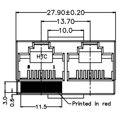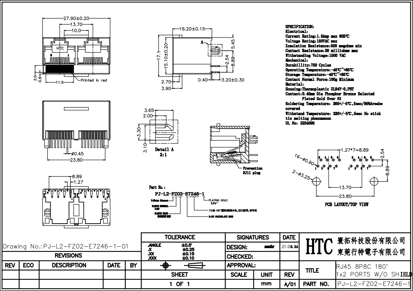 RJ45 PURE,1X2,180°,THT,No shell,15.1,G/F,27.9*15.1*16.2,Without,Without